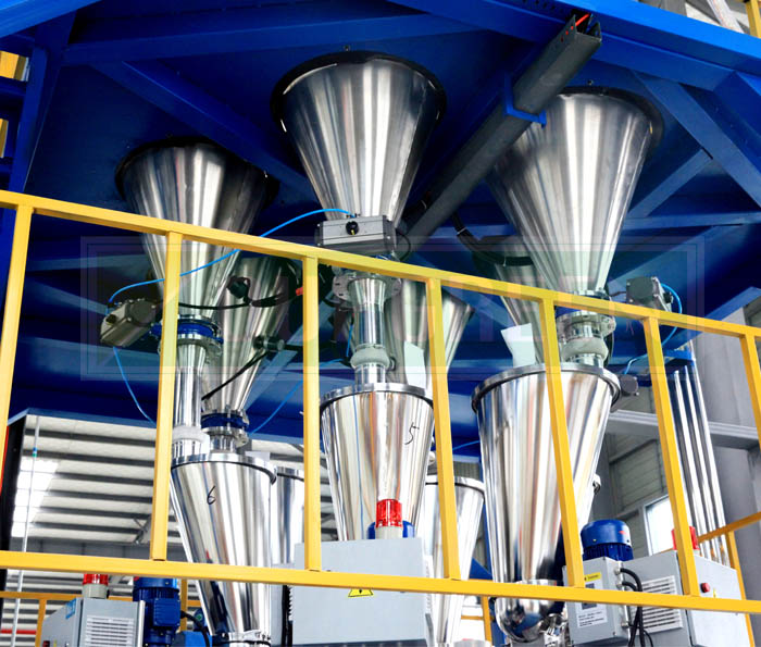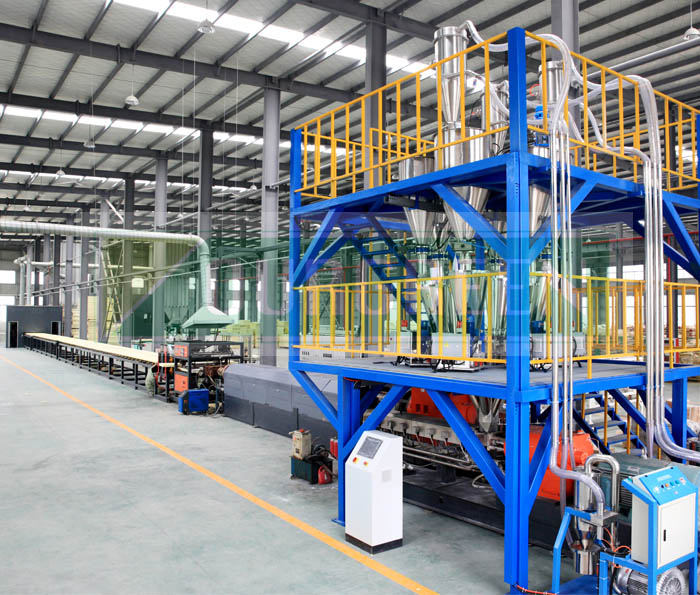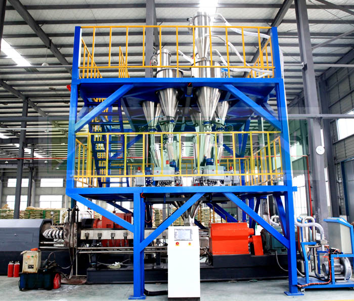 公司的自動上料系統采用特制的攪拌上料系統,以確保各種原料混合的均勻。自動化控制保證系統運行穩定,按照生產配方將各組分別加入到料倉中,經真空上料機后充分攪拌,后將攪拌均勻的物料加入到擠出機的料斗中。該產品由公司優化設計,使其能夠適應各種型號的擠出機組。